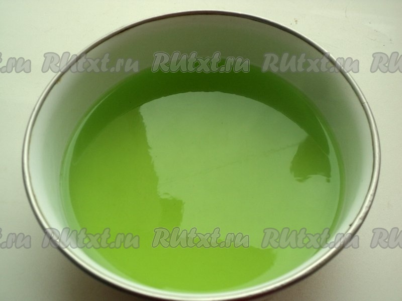 Приготовить желе в соответствии с инструкцией на пачке, только воды взять на половину меньше. Вылить желе в лоток и охладить.