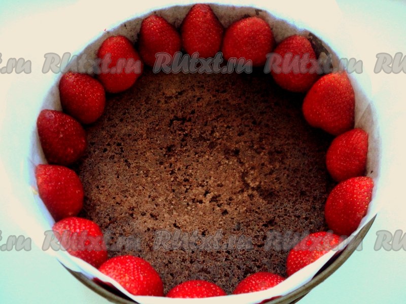 Бока формы выложить бумагой для выпечки, на дно положить шоколадный бисквит. Часть клубники разрезать пополам и установить их  плотно по периметру формы срезом к бокам формы.