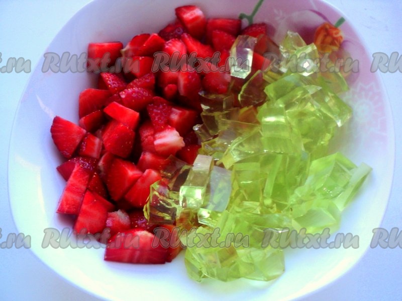 Остальную клубнику порезать на кусочки. Так же кубиками порезать застывшее желе.