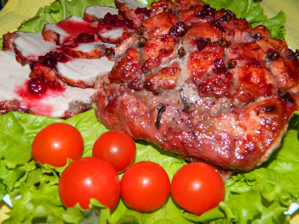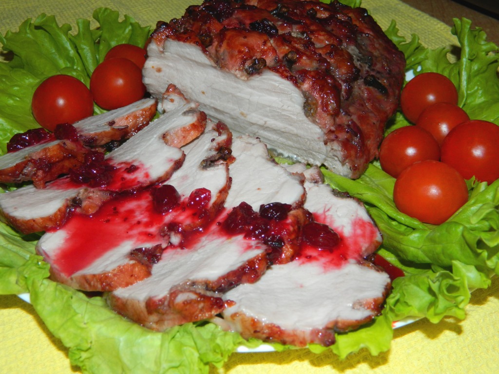 Свинину, запечённую с клюквой, вынимаем из духовки и подаём к столу в качестве холодной закуски на праздничный стол или в качестве основного горячего блюда для домашнего ужина.