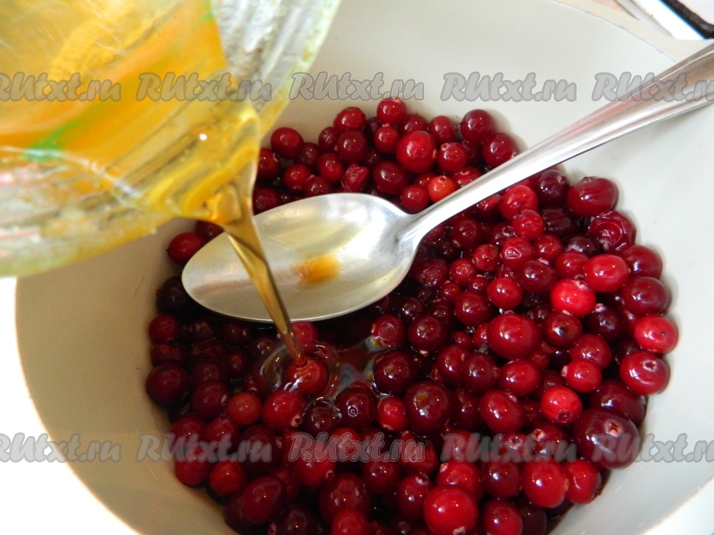 Замороженную клюкву нужно достать заранее, чтобы она разморозилась. Если мёд засахаренный, его нужно растопить на водяной бане. Клюкву перекладываем в небольшую кастрюльку, добавляем мёд, ставим на средний огонь, помешивая и разминая часть ягод, чтобы они дали сок, даём закипеть, уменьшаем огонь и провариваем, перемешивая, несколько минут, чтобы клюквенный маринад немного загустел.