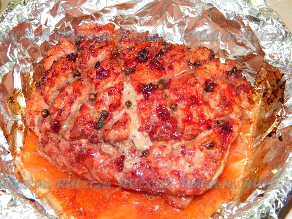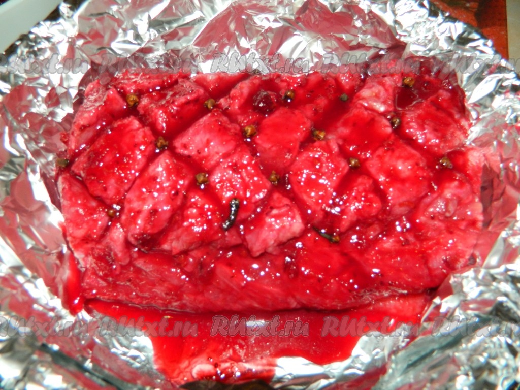 Дальше убираем ягоды клюквы с мяса. Перекладываем свинину в форму, застеленную фольгой. Вставляем по всему мясу бутоны гвоздики. Поливаем мясо соком от маринада. Заворачиваем свинину в фольгу и отправляем в разогретую духовку запекаться при температуре 180 градусов на минут 60.