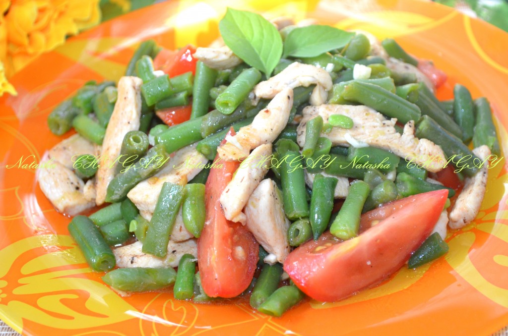 Хочу предложить вам рецепт салата с курицей, стручковой фасолью и помидорами. Салат довольно легкий, свежий и вкусный. Идеально подойдет в качестве второго блюда на обед или для ужина.