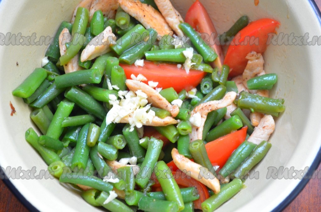 Выложить в салатник. Лёгкий, свежий и вкусный салат с курицей, стручковой фасолью и помидорами готов к подаче.