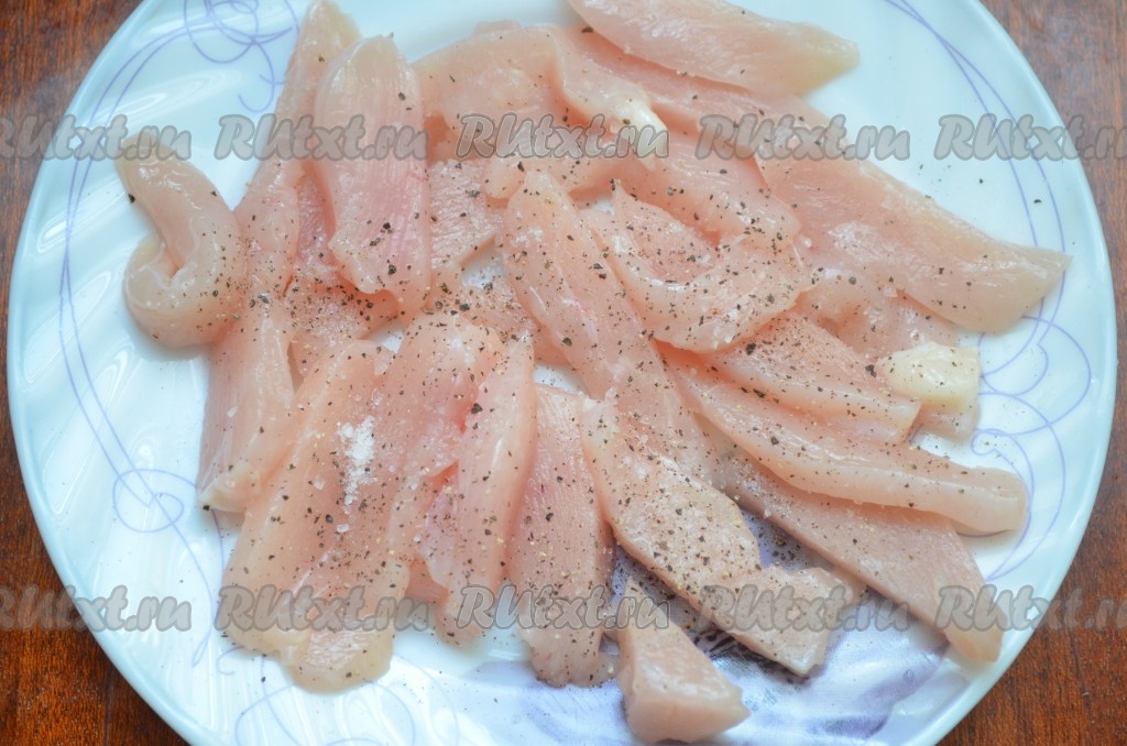 Филе порезать тонкими полосками. Посолить и поперчить.