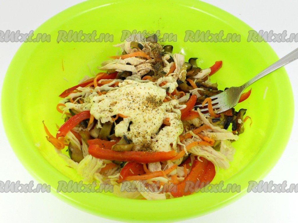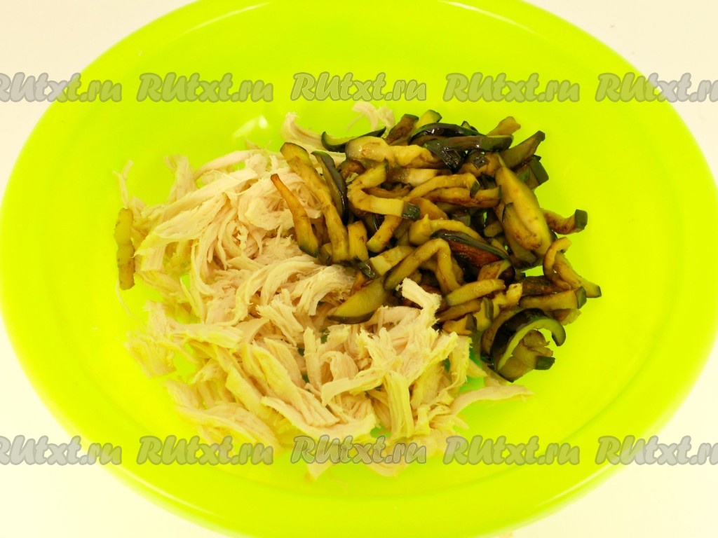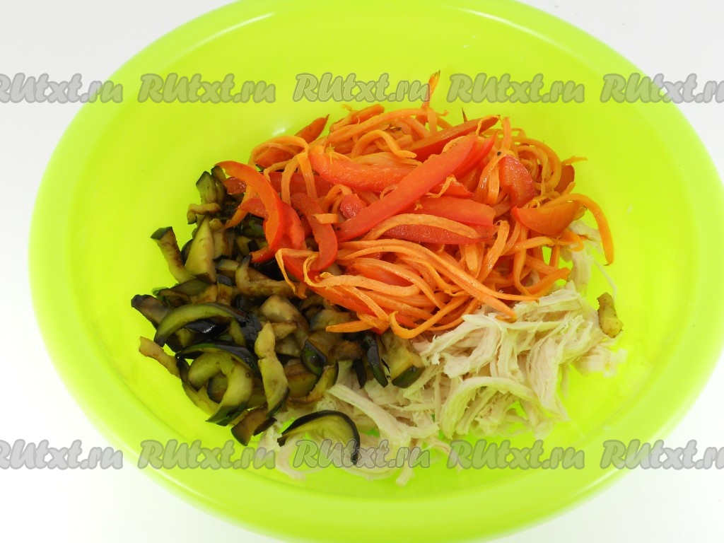 Морковь натереть на терке для корейской моркови, перец болгарский нарезать соломкой. Обжарить на растительном масле около 3-4 минут - до мягкости овощей. Также выложить на салфетку и остудить. Куриное филе предварительно отварить в подсоленной воде и остудить. В глубокую миску разобрать мясо руками на тонкие волокна. Добавить баклажаны.