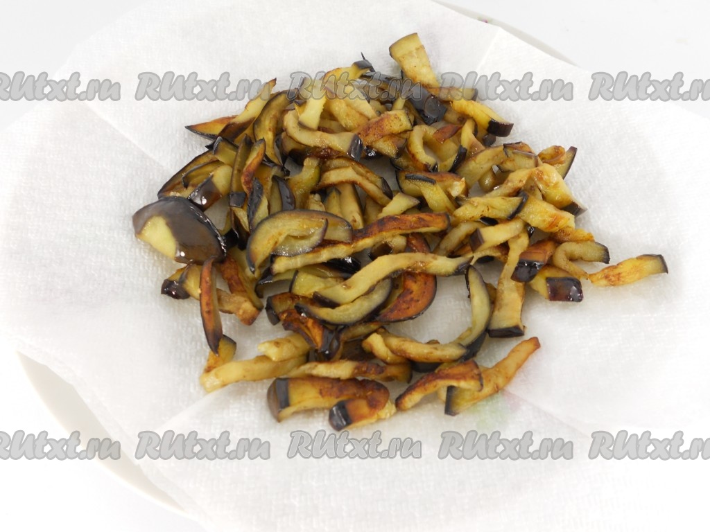 Затем обжарить баклажаны на растительном масле на довольно сильном огне до румяной корочки, все время помешивая. Выложить на бумажную салфетку для удаления лишнего масла. Дать остыть.