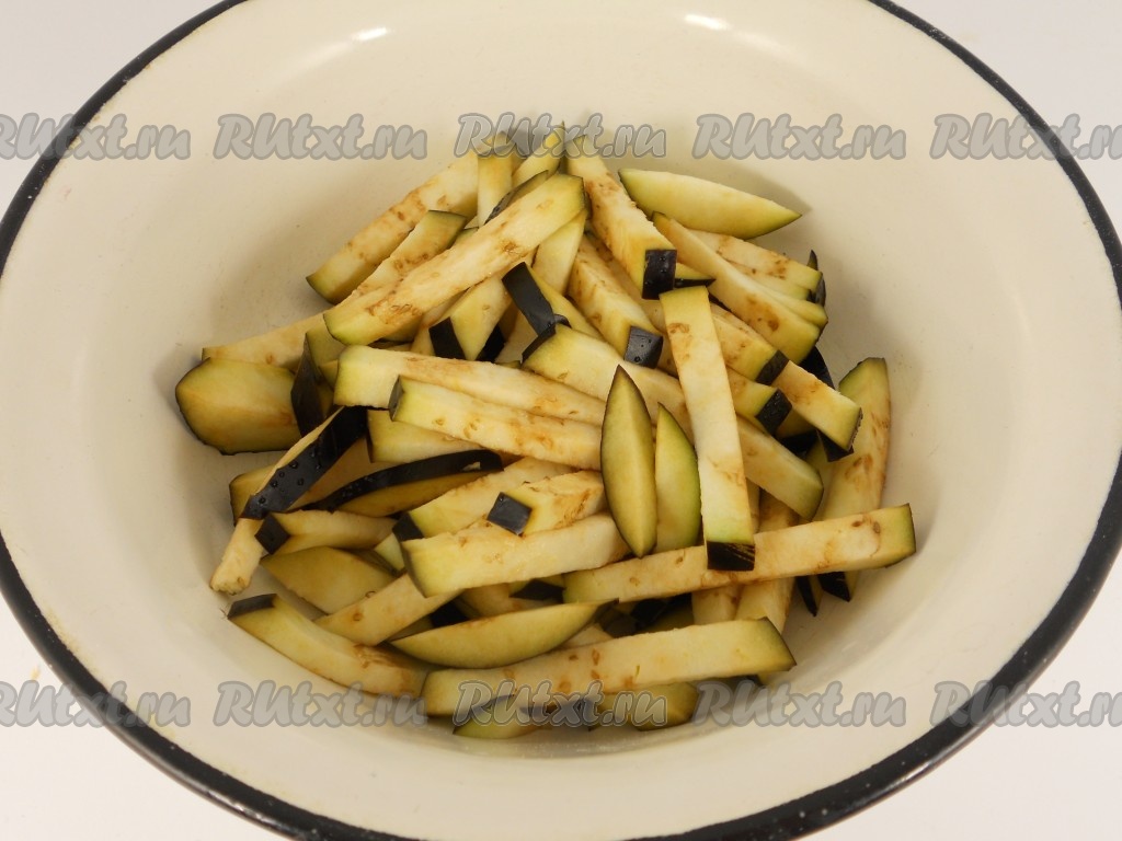 Баклажан порезать соломкой. Посолить и оставить на 20 минут.