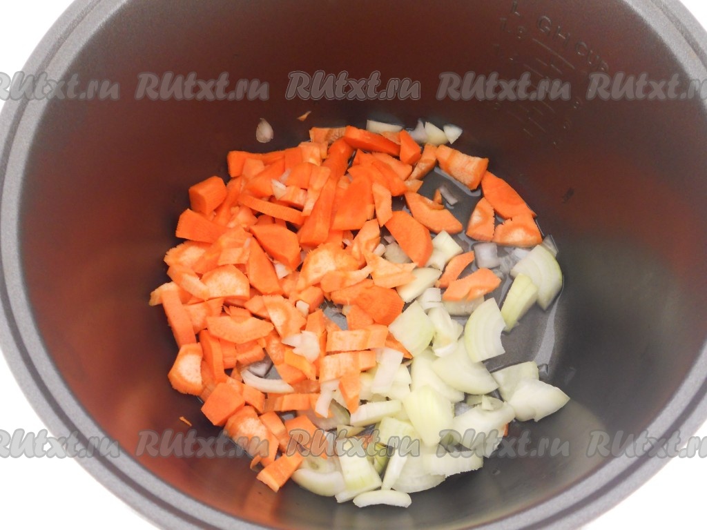 В чашу мультиварки влить растительное масло. Добавить нарезанные средними кусочками репчатый лук и морковь. Выставить режим "Выпечка" на 20 минут. Несколько раз овощи следует перемешать.