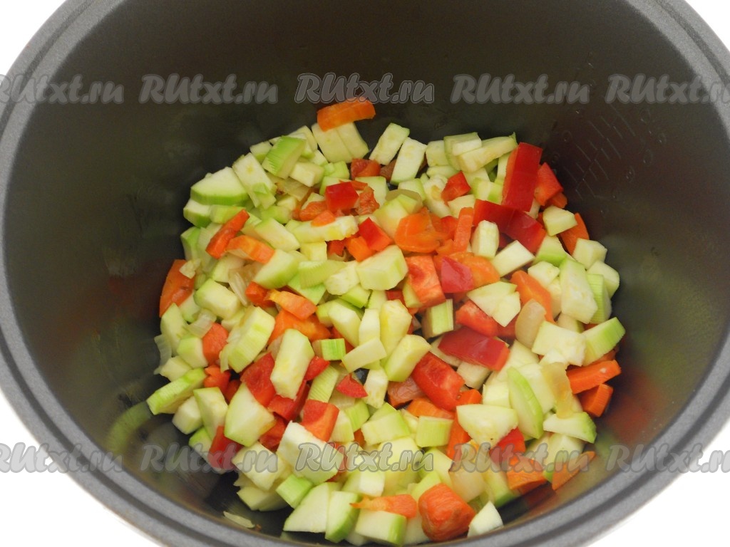 Добавить нарезанные кубиками кабачки и сладкий болгарский перец. Также выставить режим "Выпечка" еще на 20 минут.