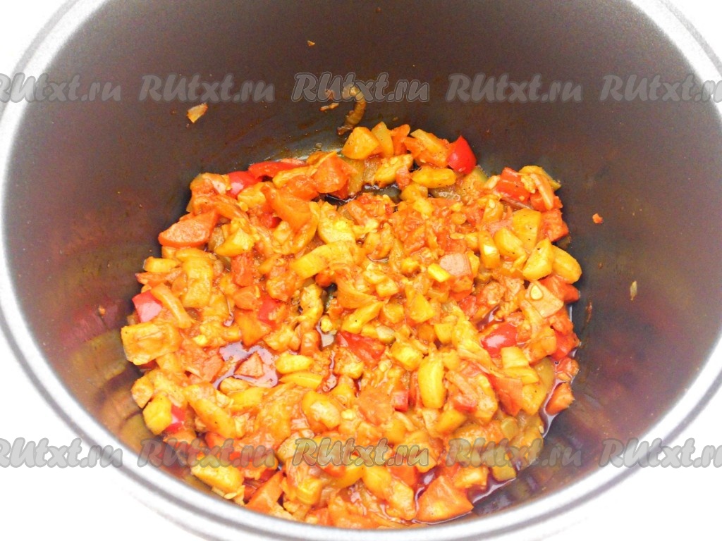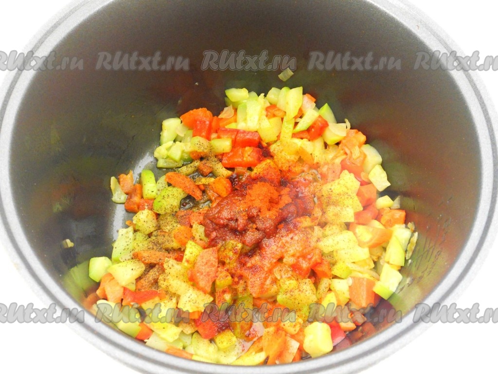 Далее добавить томатную пасту, сахар, соль, паприку, черный и красный молотый перец. Перемешать и выставить режим "Тушение" на 35 минут. Несколько раз овощи следует перемешать.