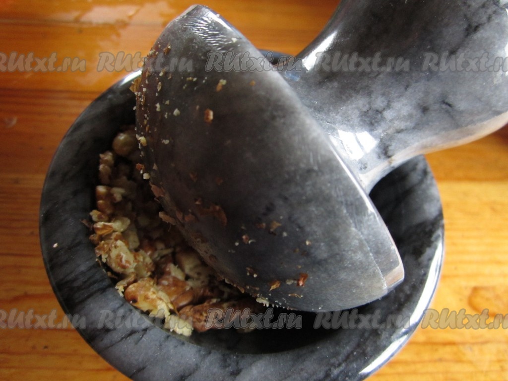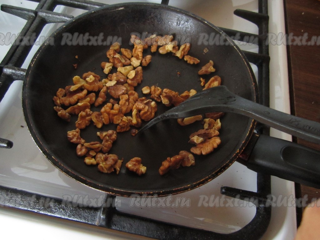 Сначала слегка подсушите на горячей сковороде без масла горсть грецких орехов и отставьте их в сторону остывать.