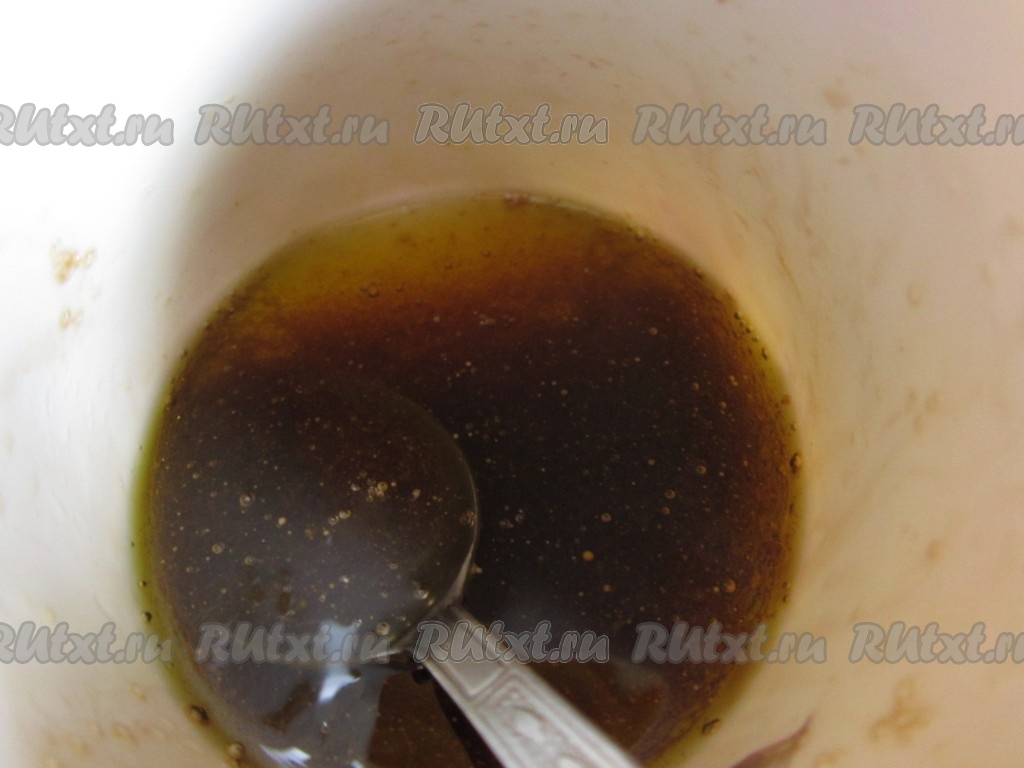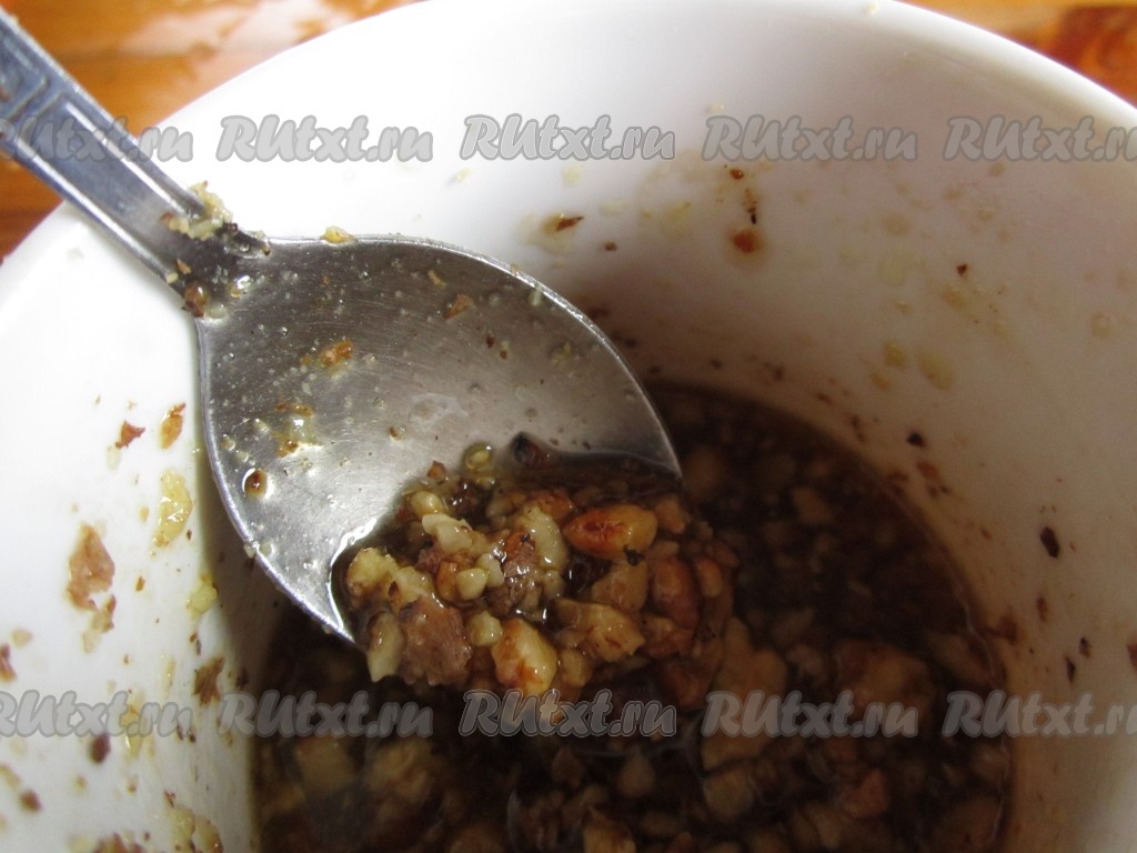 Добавьте измельчённые орехи в заправку и хорошо перемешайте.