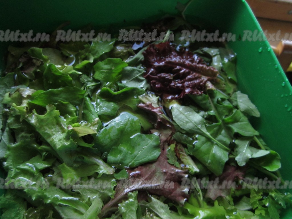 Листья салата помойте и замочите в ледяной воде минут на 20, чтобы их немного освежить (если Вы купили салатную смесь в упаковке, то она, скорее всего, уже полностью готова к употреблению - в этом случае Вам не надо салат ни мыть, ни измельчать. Можно сразу переложить в салатник).