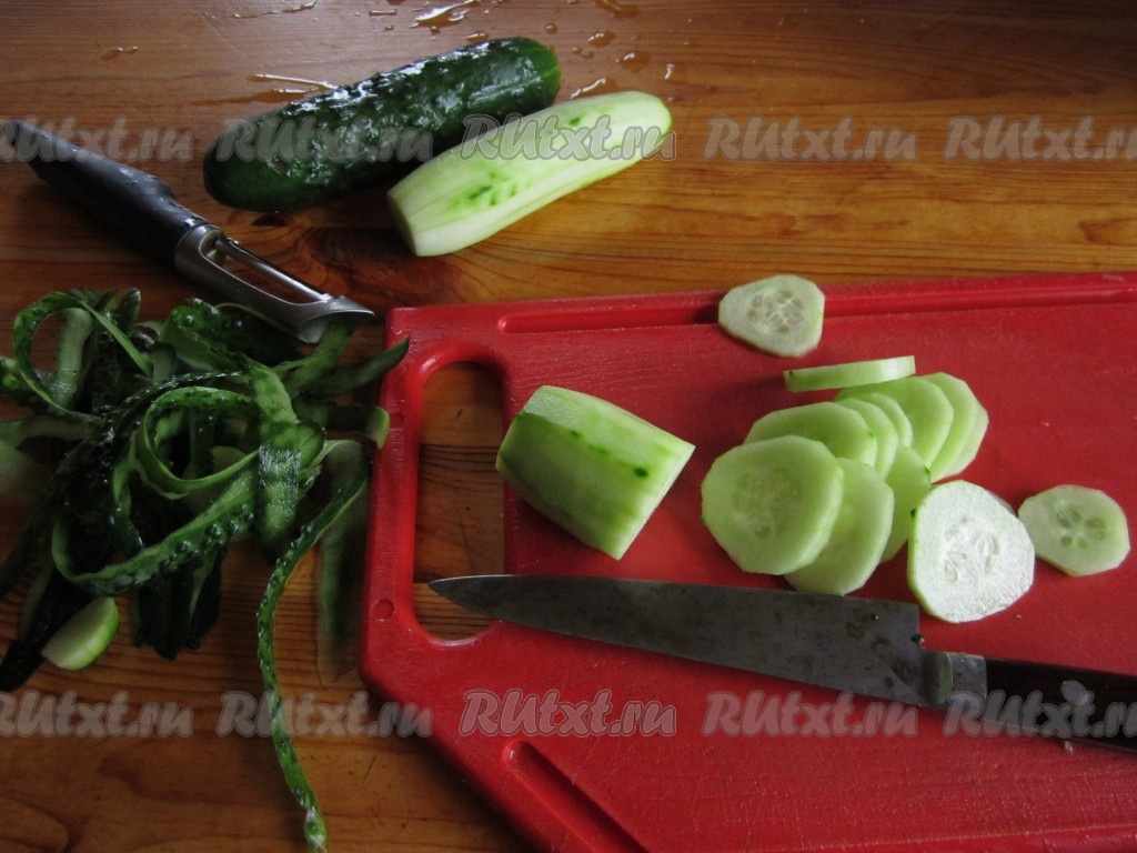 Огурцы очистите от кожицы и нарежьте тонкими кружочками.