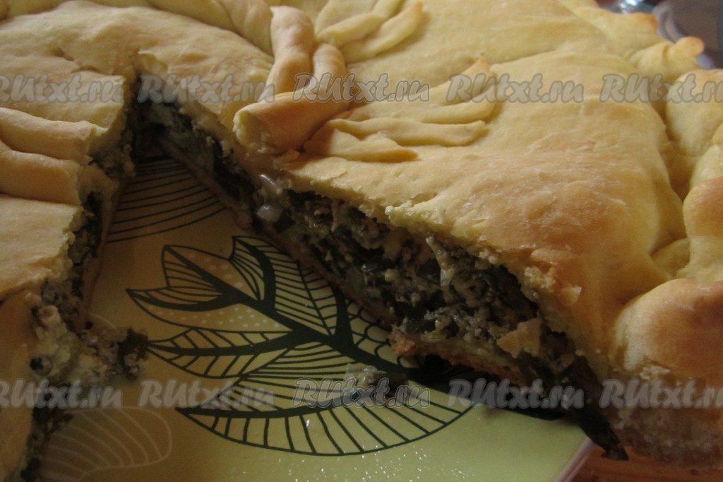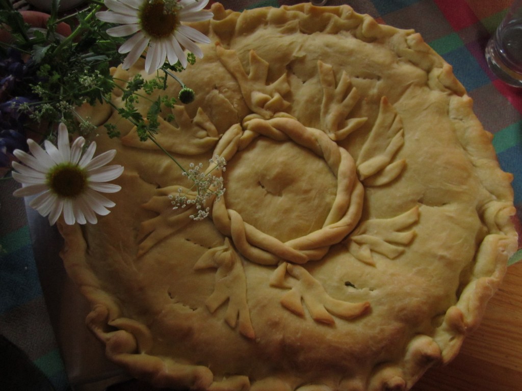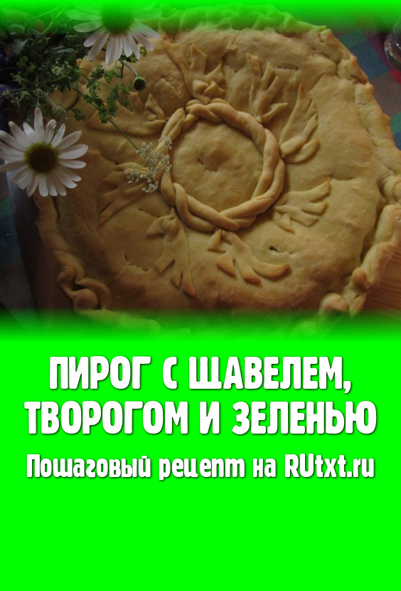 От второй части теста отщипните немного и отложите для украшения пирога. Из оставшегося теста раскатайте вторую лепёшку, накройте ею пирог сверху, защипните края. Сделайте украшения для пирога из отложенного кусочка теста и украсьте пирог с щавелем на Ваше усмотрение.