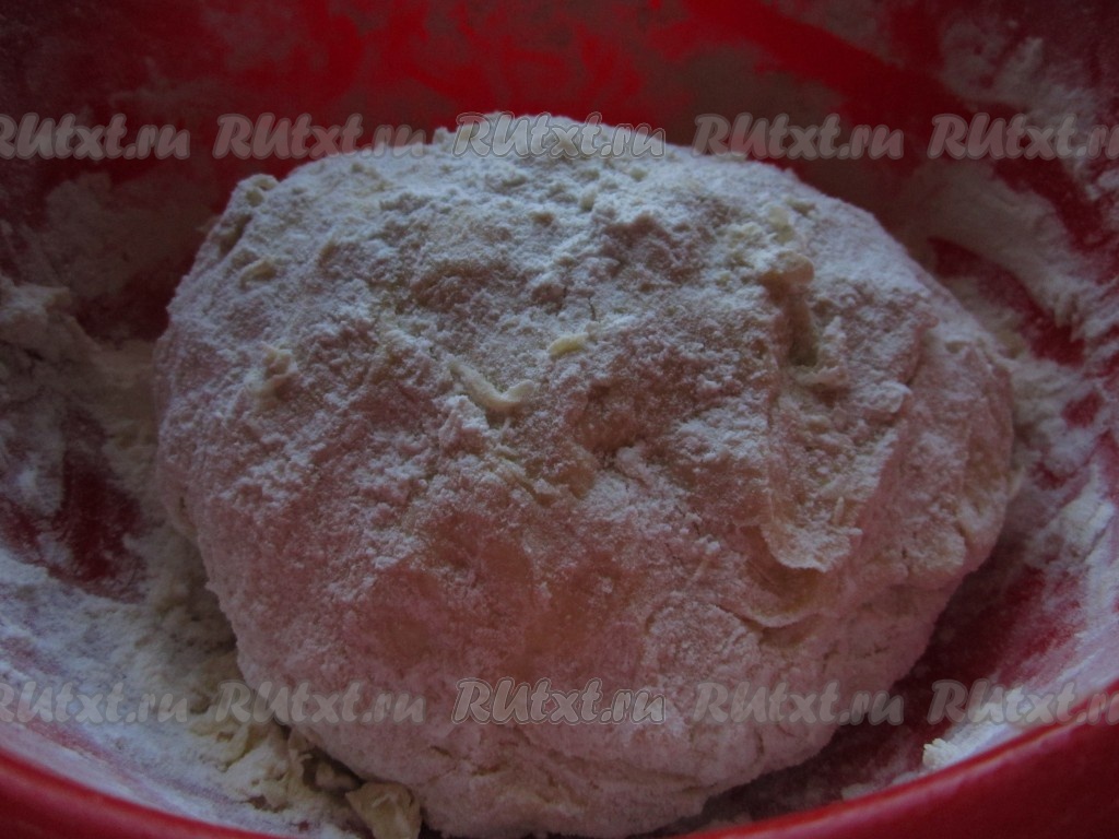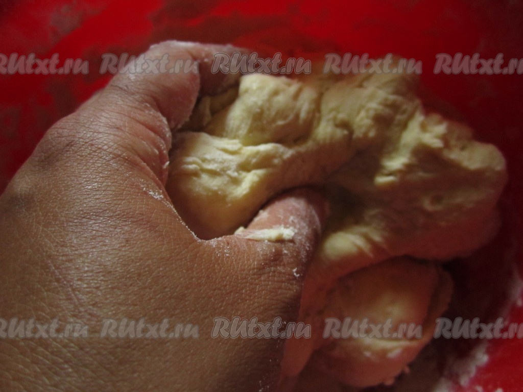 Подсыпайте в миску понемногу муку и замесите тесто. Оно должно получиться достаточно эластичным и мягким. Хорошо вымесите тесто. Присыпьте сверху мукой.