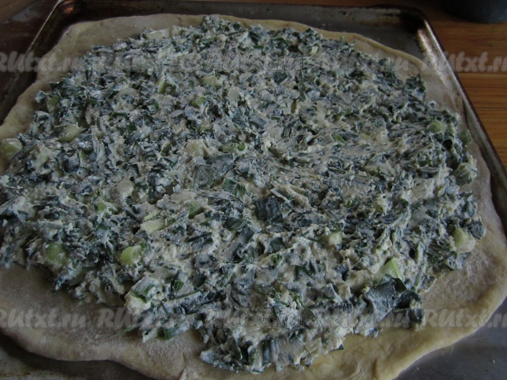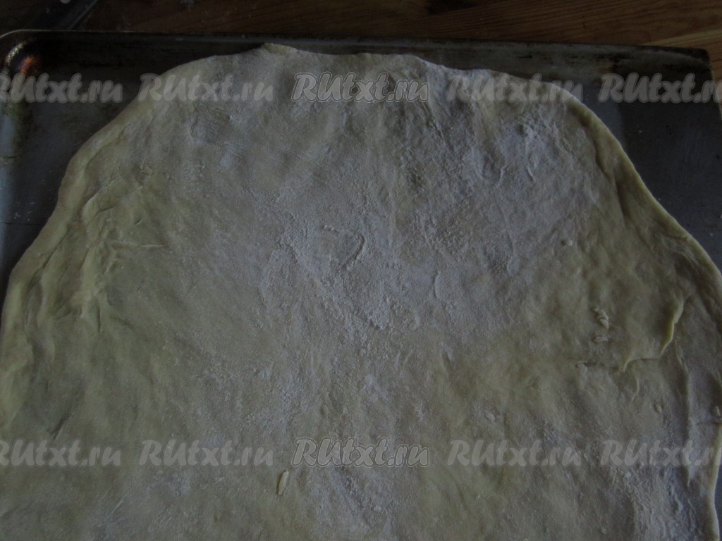 Одну половину теста раскатайте в тонкую лепёшку и переложите на смазанный маслом противень.