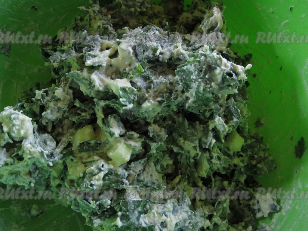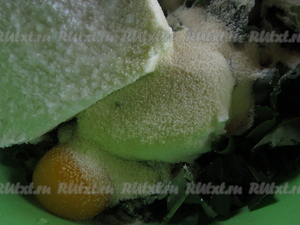 Соедините все составляющие начинки (творог, яйцо, щавель, лук, зелень, манка, соль) в глубокой миске.