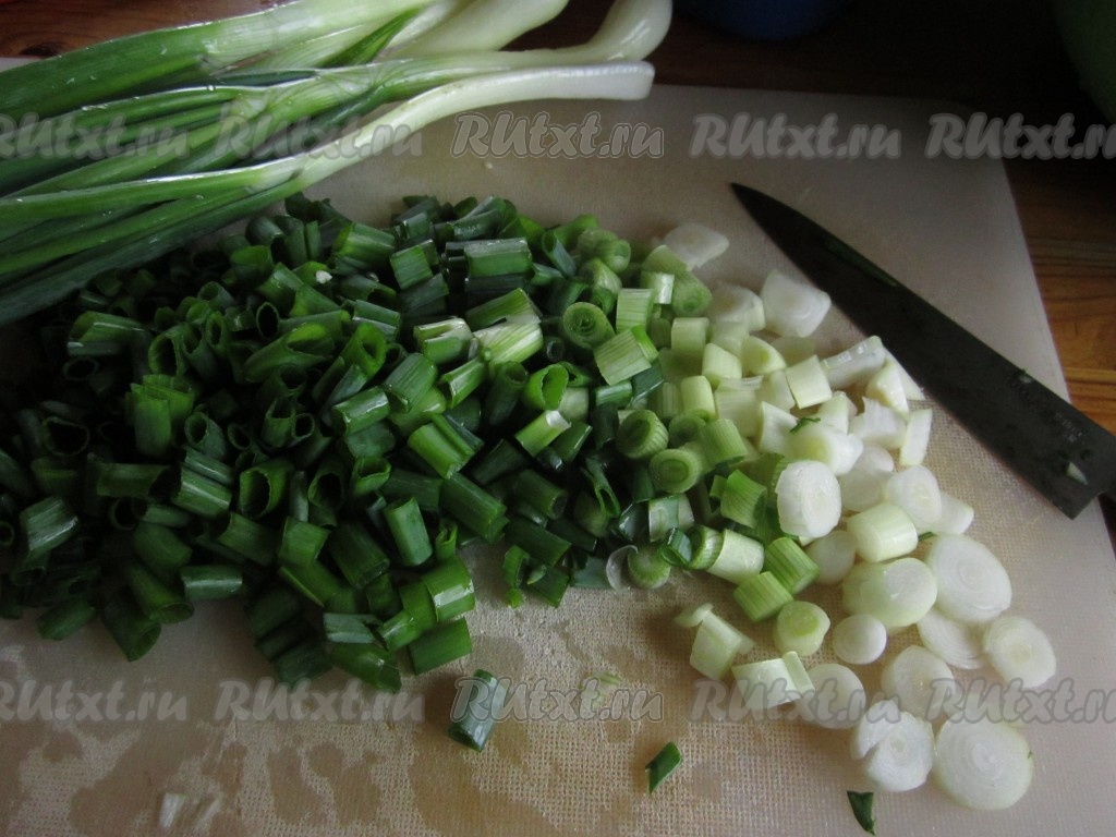 Зелёный лук нарежьте колечками вместе с белой частью.