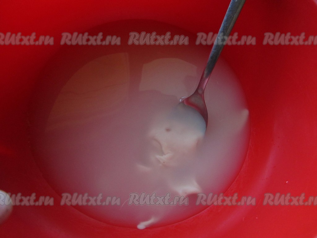 В глубокой миске растворите в 1,5 стаканах тёплой воды сахар и дрожжи. Оставьте смесь на несколько минут.