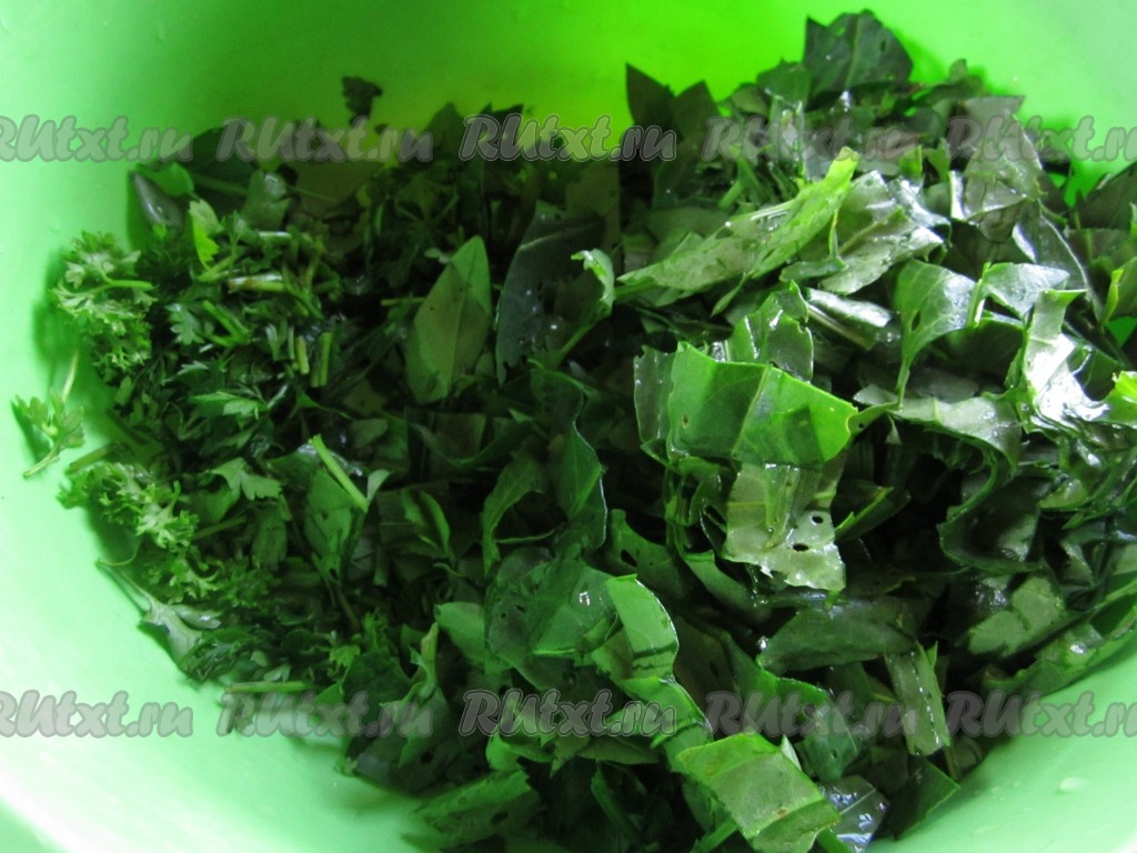 Тем временем займёмся начинкой для пирога. Зелень, лук и щавель хорошо помойте. Щавель и зелень крупно нарежьте.