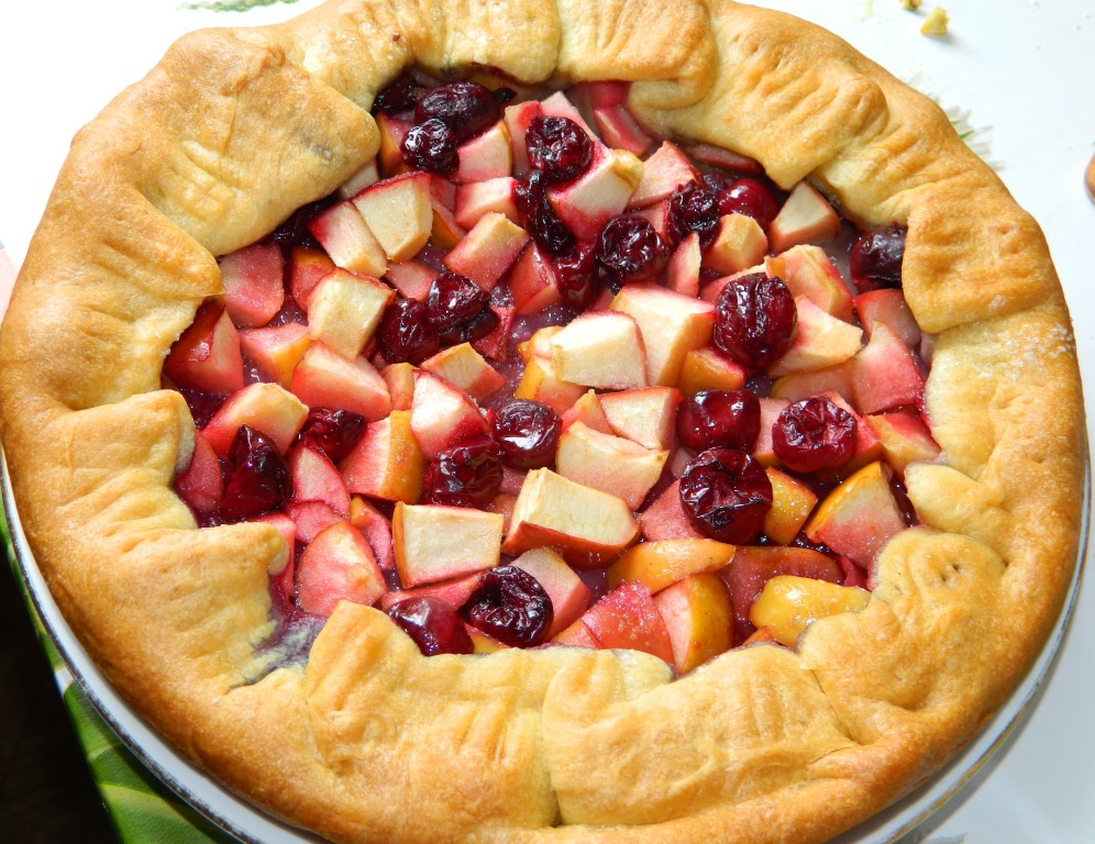 Достаём вкусный, нежный, аппетитный песочный пирог с сочной начинкой из яблок и вишни из духовки, даём остыть.