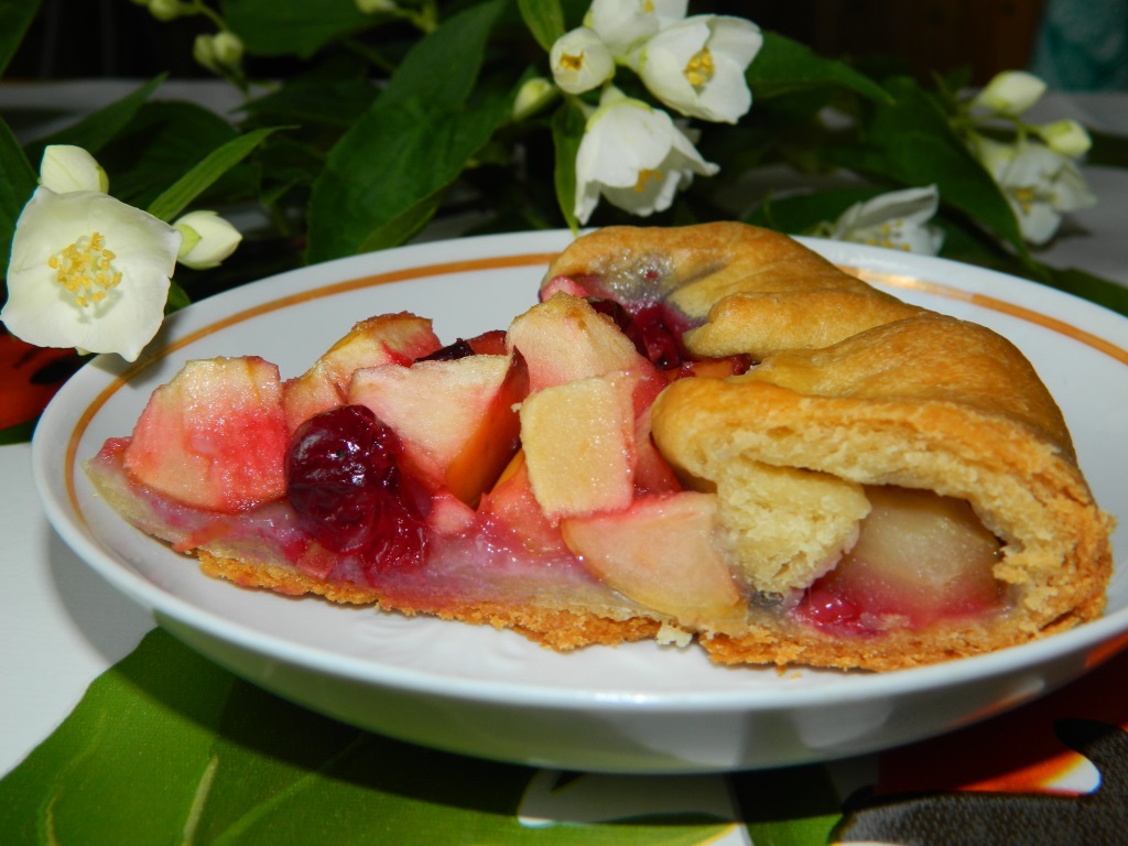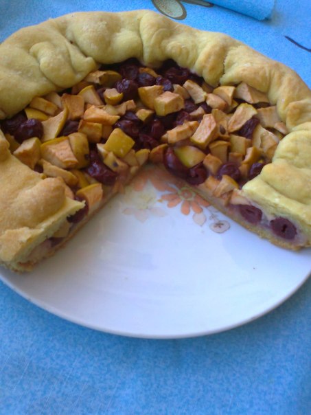 Достаточно часто пеку пирог с яблоками и вишней по этому простому рецепту. Времени на приготовление уходит немного, постное песочное тесто замешивается из самых доступных продуктов. А результат всегда выше всяких похвал. Сочетание тонкого, нежного песочного теста и достаточно большого количества сочной начинки делает этот пирог очень вкусным. Вишня дарит выпечке приятную кислинку. Этот пирог идеально подходит в качестве дополнения к чаепитию в кругу родных и близких!