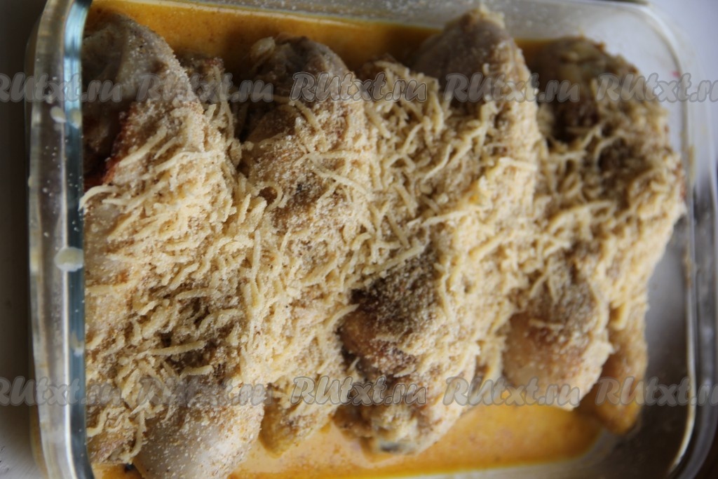 В форму для запекания выложить куриные ножки с соусом. Отдельно смешать сухари, оставшийся натёртый сыр и обильно посыпать нашу курицу.