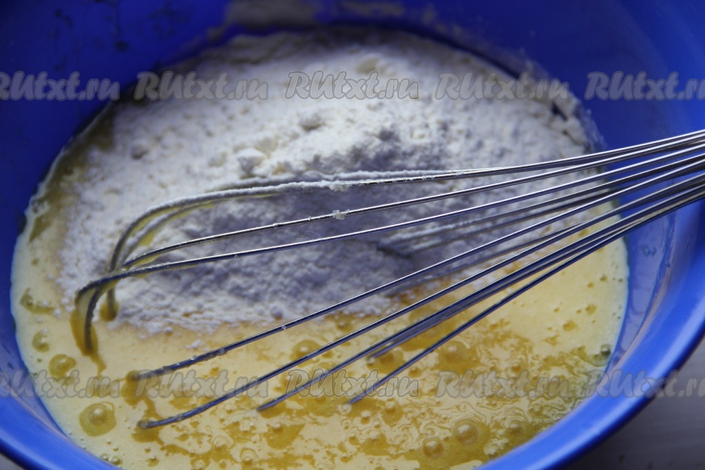К яйцам, взбитым с сахаром, добавить растительное масло, перемешать венчиком, частями начать всыпать муку, вмешивая её в тесто с помощью венчика. Добавляя муку, учитывайте, что замешанное тесто должно напоминать сметану средней густоты.