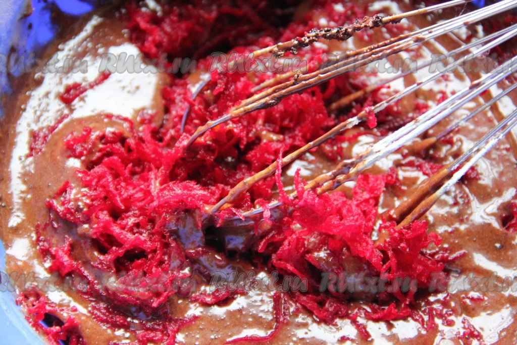 В получившееся тесто добавить натёртую сырую свеклу и растопленный остывший шоколад, перемешать.