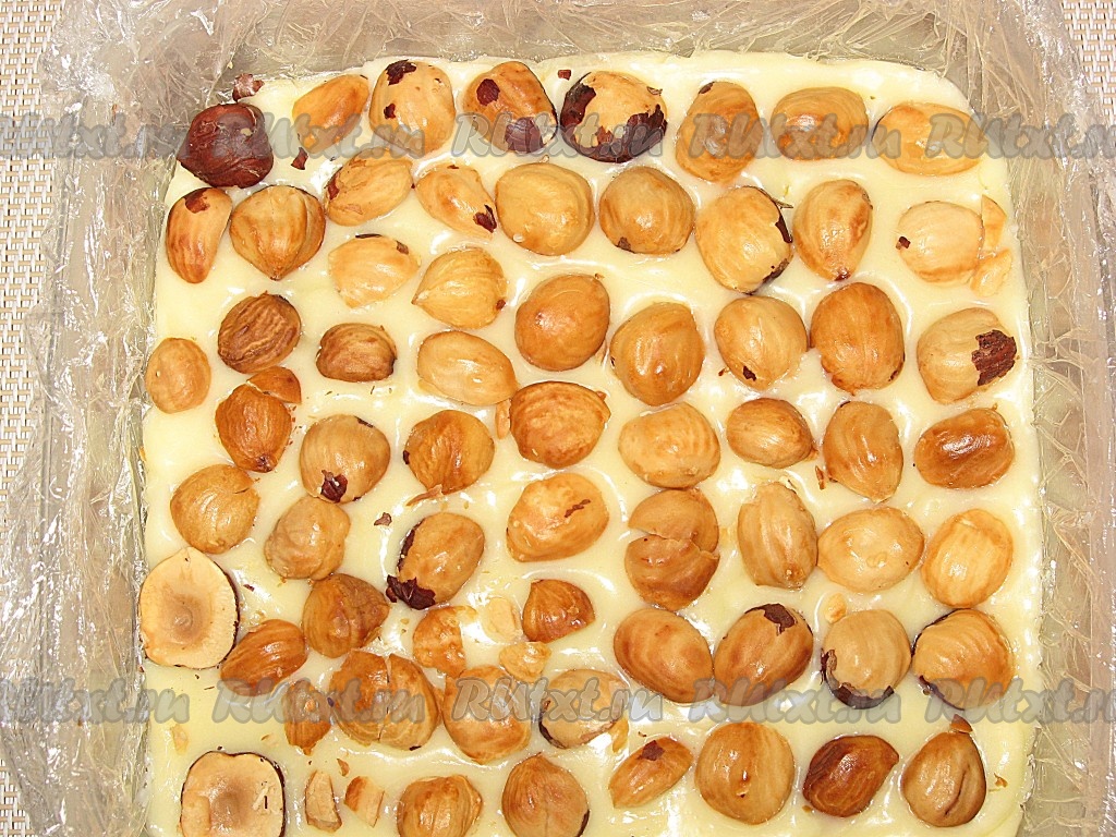 Разровнять, чтобы вишни не было видно, сверху выложить орешки, также слегка вдавливая их в массу.