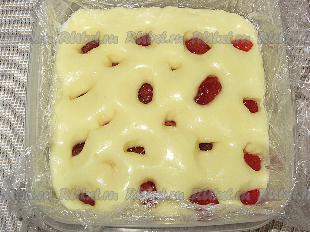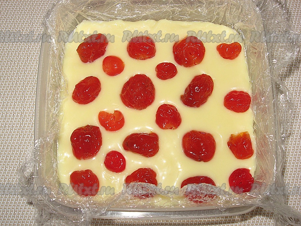 Выложить массу в квадратную емкость (у меня 12х12 см), застеленную пищевой пленкой. Сверху разложить вишню.