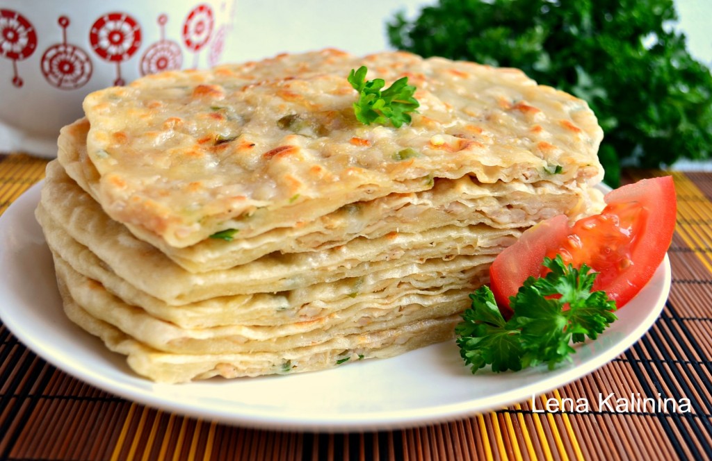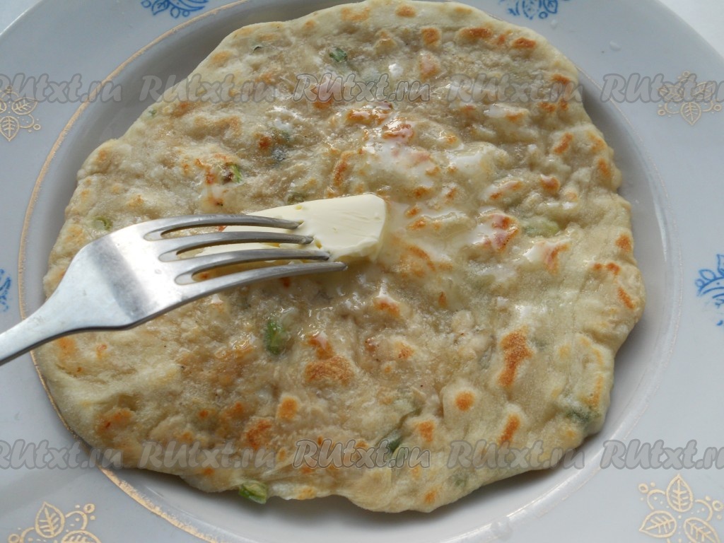 Таким образом сформировать остальные лепешки, но делать это нужно во время жарки предыдущей, все сразу не нужно, так как тесто от мясного сока расползется. Жарить лепешки на сухой сковороде на среднем огне с двух сторон до румяного цвета (примерно по 3-5 минут с каждой стороны). Готовые лепешки  хорошо смазать сливочным маслом.