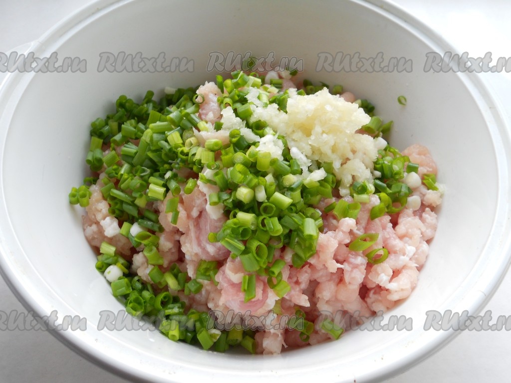Для начинки: к фаршу добавить измельченный зеленый лук, чеснок, пропущенный через пресс.