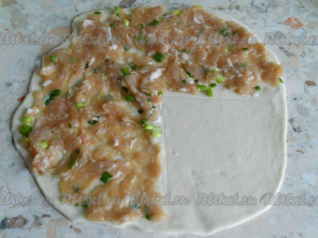 Далее каждый шарик теста раскатать в тонкую лепешку (диаметр - 20-22 см). На нее распределить фарш на 3/4 части.