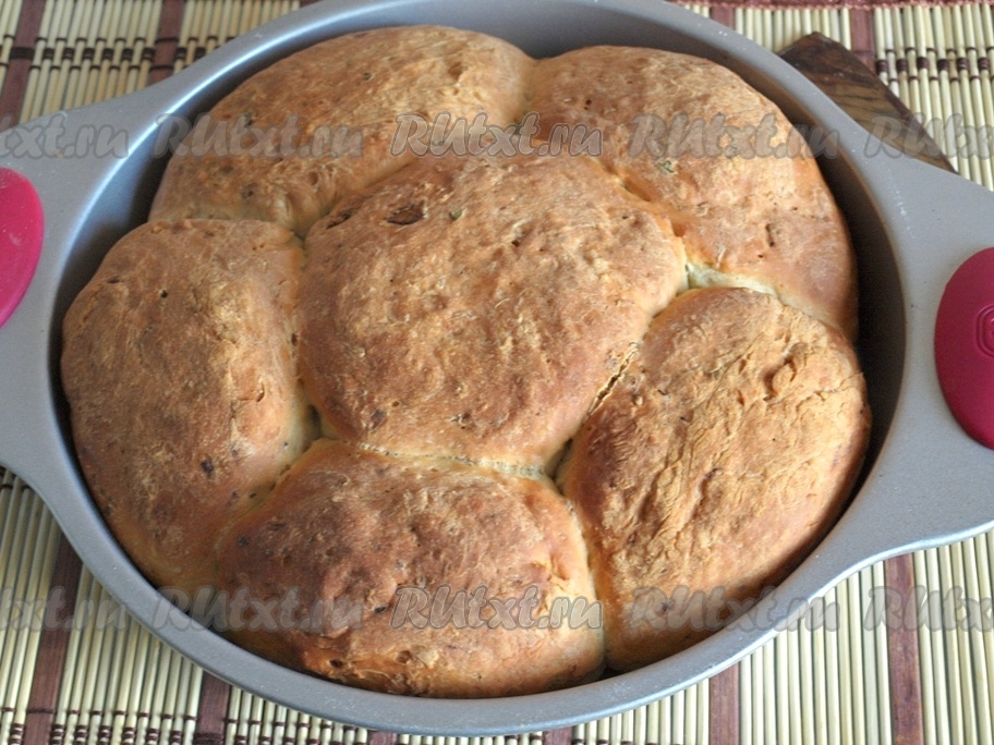 Добавляем муку и вымешиваем мягкое, эластичное тесто, не липнущее к рукам. Форму для выпекания смазываем растительным маслом. Делим тесто на несколько частей, из каждой части скатываем колобок и выкладываем в форму. Накрываем форму пищевой плёнкой и оставляем для подхода. Тесто должно увеличиться вдвое.