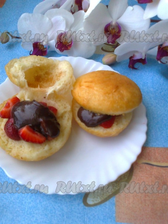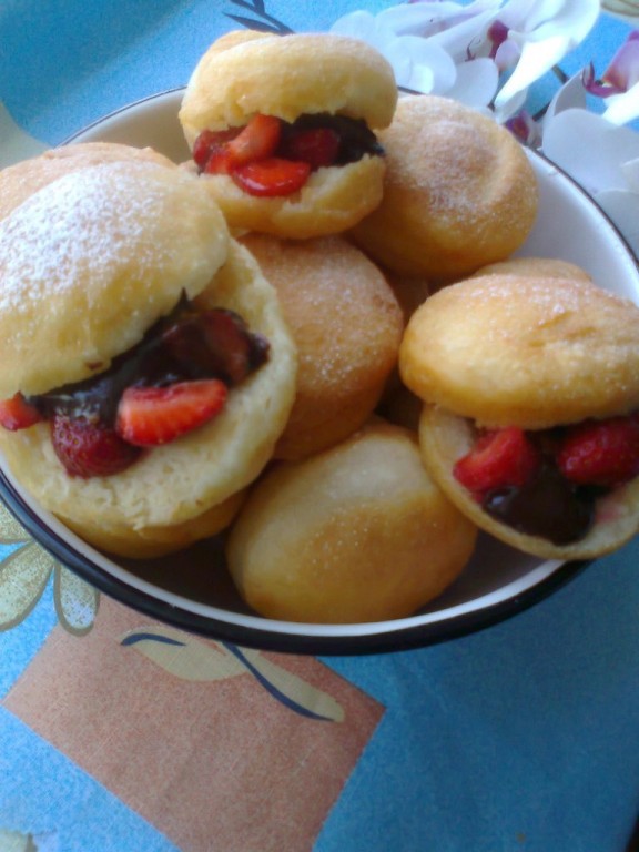 Остывшие пончики посыпать сахарной пудрой. Разрезать по средине и положить кусочки клубники, а сверху полить остывшей шоколадной глазурью.