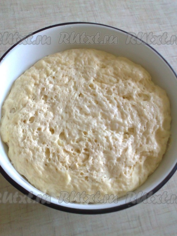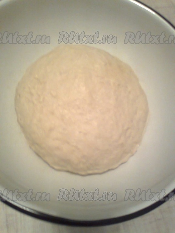 Затем в опару добавляем 125 мл растительного масла, соль и муку (4 стакана). Замешиваем тесто, накрываем пищевой пленкой и оставляем в холодильнике на ночь (или на 2 часа в теплом месте, если хотите печь сразу. Тогда за время брожения обминаем тесто 2 раза.) Если оставили в холодильнике, обминать тесто не надо.