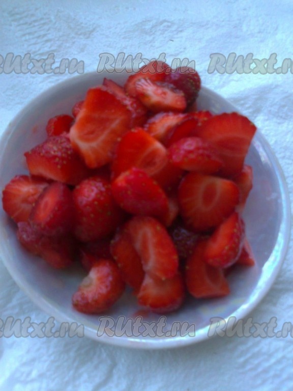 А пока приготовим начинку для пончиков. Клубнику вымыть, очистить от хвостиков, дать стечь воде и нарезать на кусочки.