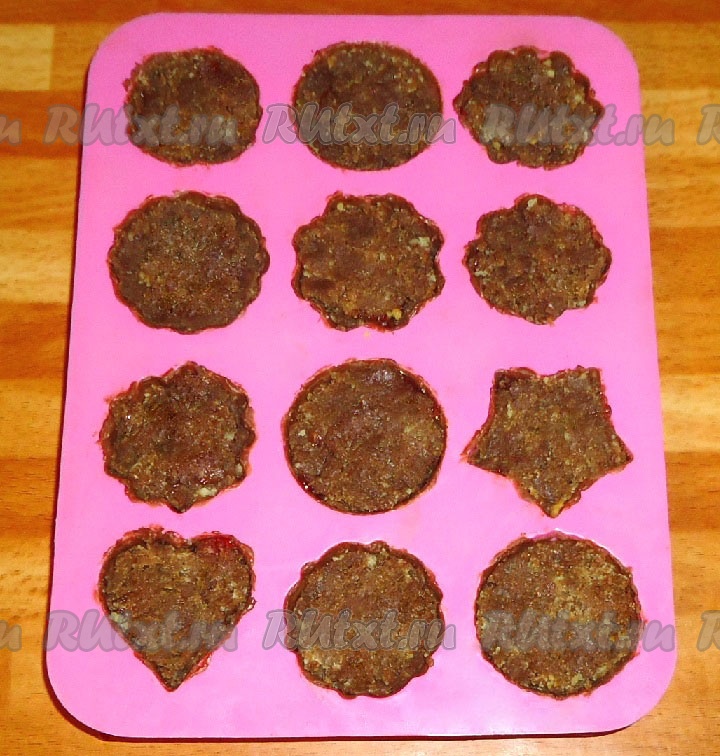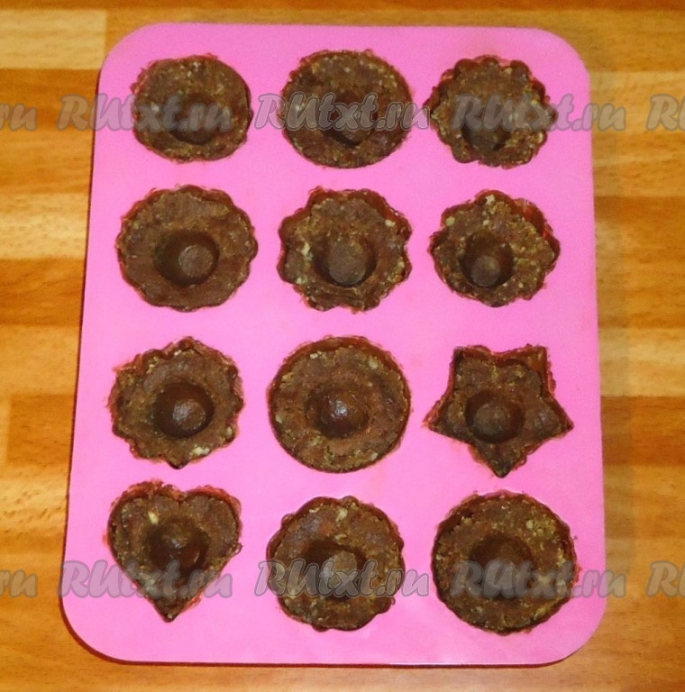 Формочки с шоколадом заполнить шоколадной массой из печенья, сделать углубления.
