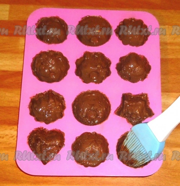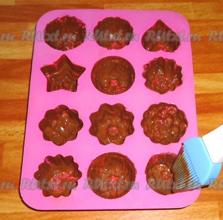 Затем ещё раз смазать формочки растопленным шоколадом и снова поставить в морозильную камеру на 5 минут.