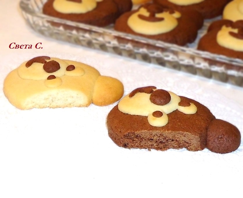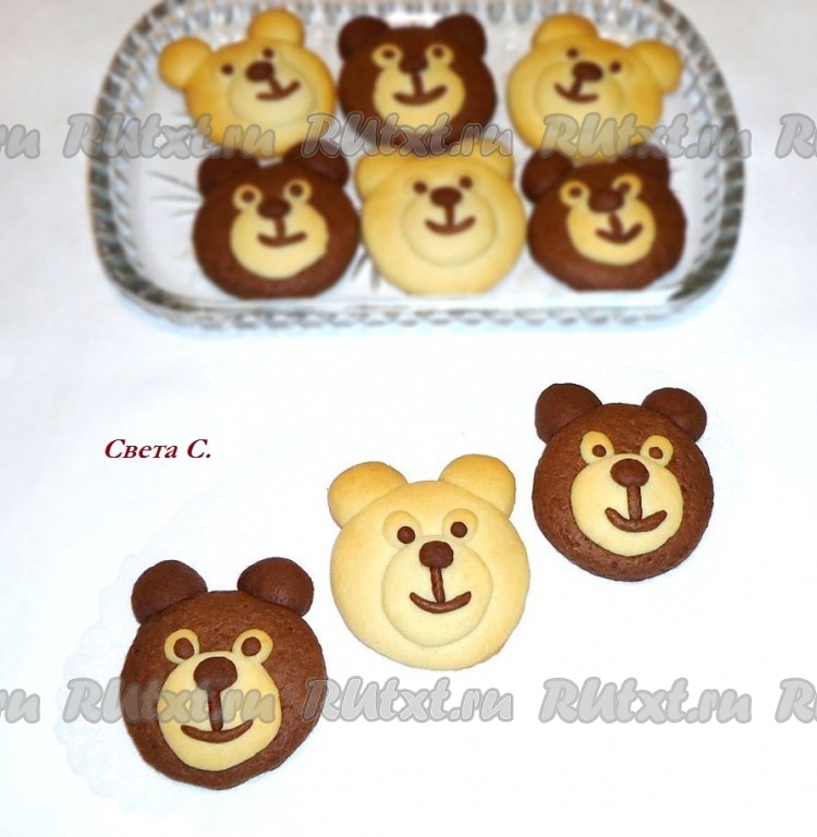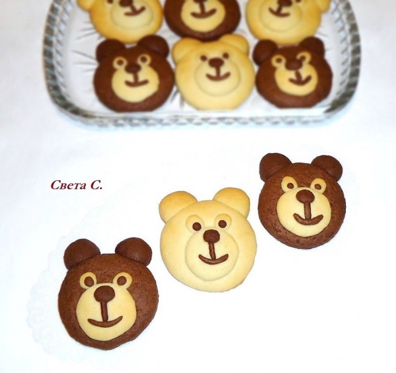 Вкусное песочное печенье из двух видов теста, оформленное в виде мишек. Оно непременно понравится и взрослым, и детям.