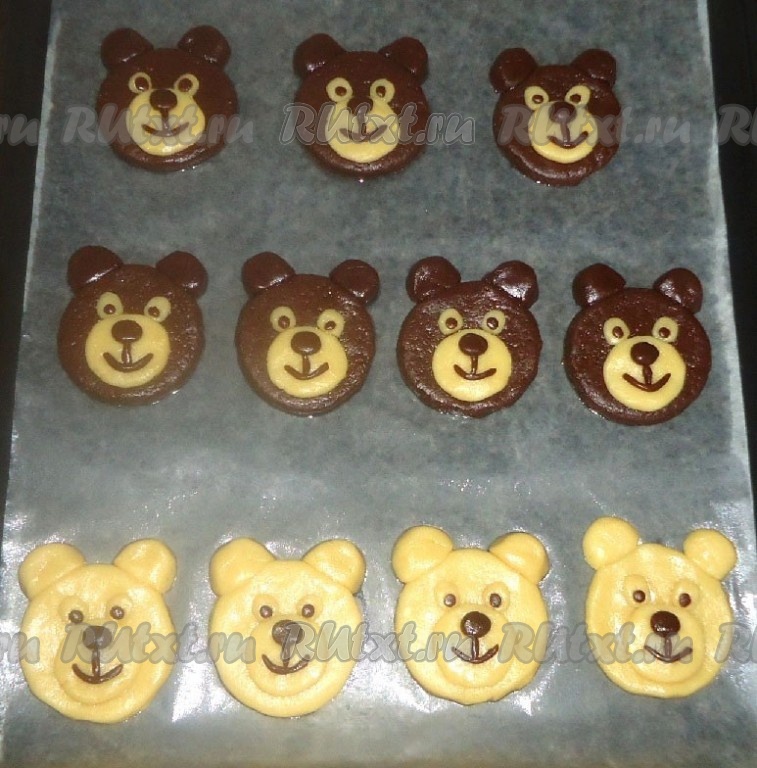 Противень застелить пекарской бумагой, смазать растительным маслом, выложить круги из теста, из подготовленных тёмных кусочков теста сформировать "уши", кусочки светлого теста раскатать в круг и выложить на тёмное тесто. Также оформить и светлых "мишек". Из светлого и тёмного теста сформировать "глаза", из тёмного теста сформировать "нос" и "рот". Выпекать печенье при температуре 170-180 градусов 15-20 минут в зависимости от духовки, нужно следить за тем, чтобы светлое печенье сильно не зарумянилось.