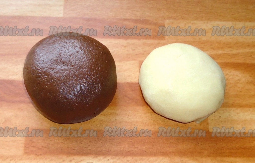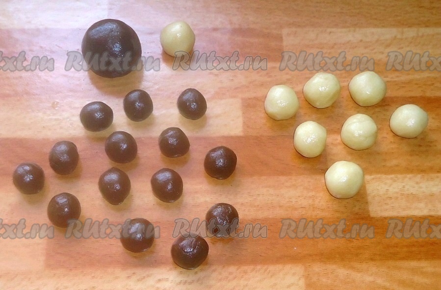 Для оформления тёмных "мишек" оставшееся тёмное тесто разделить на 15 частей - 14 равных и одну побольше. А также понадобятся 8 одинаковых частей светлого теста, размера чуть больше, чем 14 частей тёмного теста.