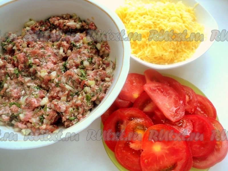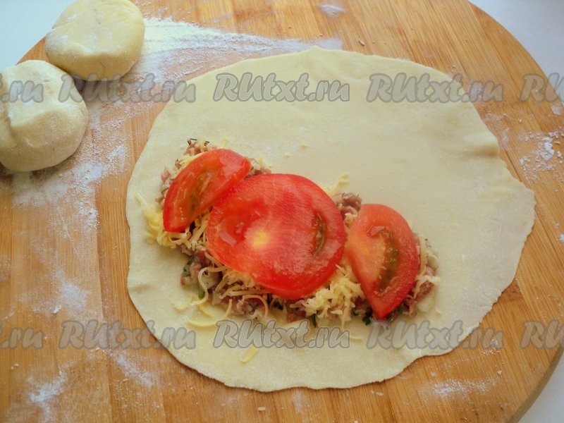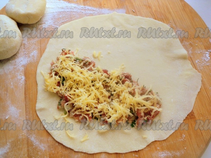 На одну сторону пласта положить 2 столовые ложки мясной начинки, разровнять и посыпать сыром.