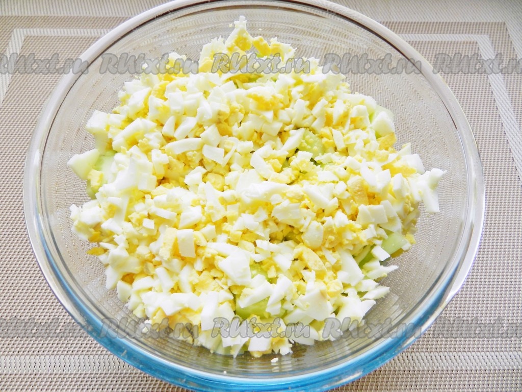 Очистить яйца, нарезать мелко и добавить в салат.