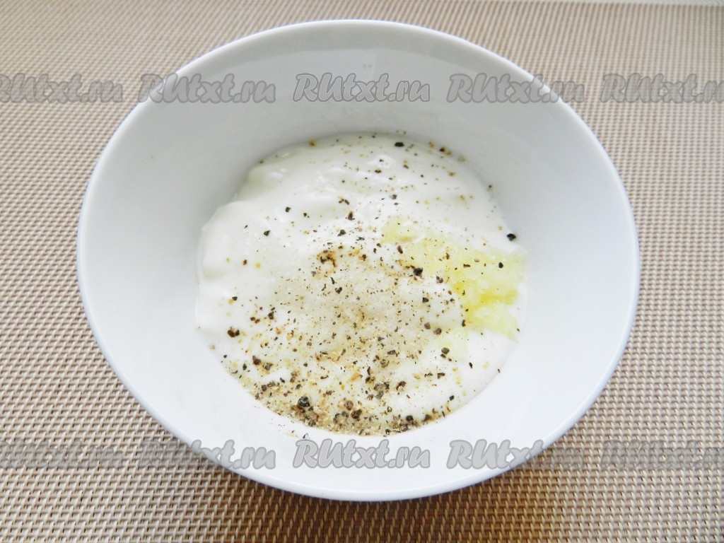 Приготовить заправку для салата. Для этого в йогурт выдавить чеснок, добавить по вкусу соль и перец, все перемешать.