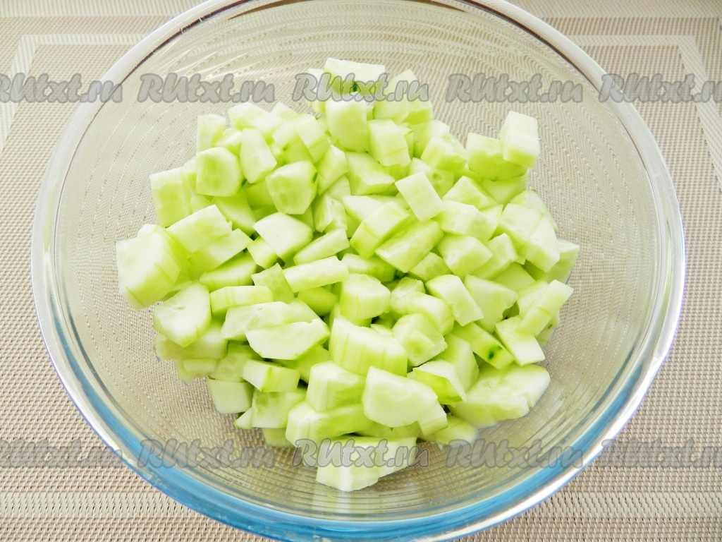 Огурцы очистить от кожицы, нарезать кубиками и выложить в салатницу.