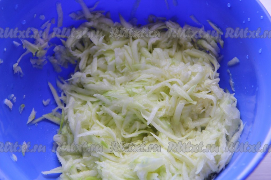 Кабачок очистить от кожуры, если семечки крупные, их тоже нужно удалить. Подготовленный кабачок натереть на крупной тёрке, посолить и оставить на 20 минут. Через 20 минут отжать кабачок от лишнего сока (этот сок нам не понадобится).